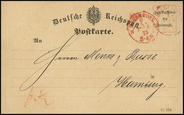 "Magdeburg F.N.3", K1 in rot zweimal auf Postkarte 1873 nach Magdeburg. Auf einer Postkarte seltene Entwertung!