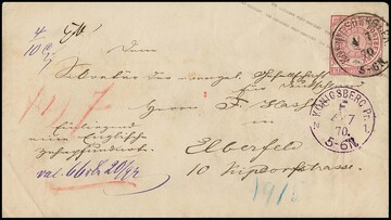 "Königsberg Pr. F.N.1", violetter Franko-K1, nebst schwarzem K1, auf NDP-Teilfranko-Ganzsache 1 Gr. rosa (leichte Gebrauchsspuren) als Wertbrief nach Elberfeld 1870, sowie 1870/73 auf zwei Paketbriefen, dabei späteste registrierte Verwendung vom 15.9.73
