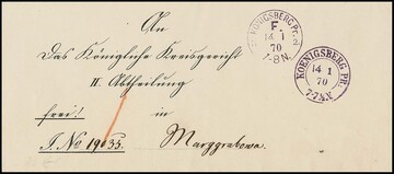 "Königsberg Pr. F.N.1", violetter Franko-K1 auf drei sehr sauberen Briefen 1867(2) und 1870, letzterer mit zusätzlich nachverw. K2 "Koenigsberg Pr." versehentlich ebenfalls in violetter Farbe (selten!)