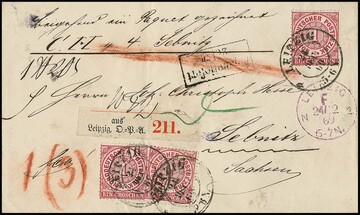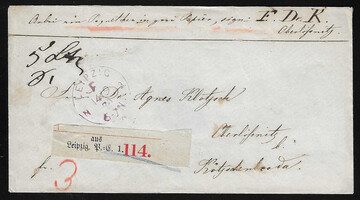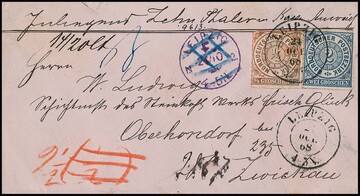 "Leipzig F.N.2", violetter Franko-K1 auf Paketbrief 1868, sowie auf Wertbrief (rs. flächig bedruckt) mit NDP 1/2 und 2 Gr., erst als Teilfranko austaxiert, dann der Franko-Stempel gestrichen, da voll frankiert, kl. Mgl.