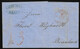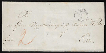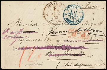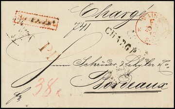 "Mainz F.N.1", roter Franko-K1 auf Brief 1867 nach Cöln, sowie teils etwas schwach auf Recobrief 1870 nach Bordeaux (Taxe "38x", im Hb. abgebildet)
