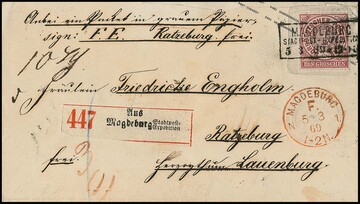 "Magdeburg F.N.1", roter Franko-K1 auf NDP-Aufbrauchs-Ganzsache 1 Gr. a. 3 Sgr. (min. unruhig geöffnet), mit schwarzem Ra3 "Magdeburg Stadtpost-Expedition" als Teilfranko-Paketbegleitbrief (restliches Porto "3" Gr. bar bezahlt) nach Ratzeburg 1869