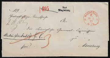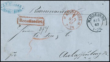 "Magdeburg F.N.3", roter Franko-K1 auf vier Briefen 1867-69, einmal Recobrief mit ungewöhnlich zusätzlichem schwarzem K2 "Magdeburg"
