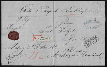 "Mainz F.N.2", 1869-73, roter (2) bzw. violetter (3) Franko-K1, auf drei Paketbegleitbriefen aus gleicher Korrespondenz nach Goerlitz, einen weiteren normalen Brief aus gleicher Korresp., sowie auf Brief nach Brambach