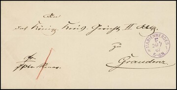 "Marienwerder F.N.1", roter (6) bzw. violetter (5) Franko-K1 auf elf Briefen 1867-72, dabei einmal eine bisher unbekannte Type vom 21.8.72 (kleineres "N.1"), fünf Paketbegl. etc.