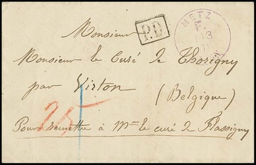 "Metz F.", 1871, violetter Franko-K1 auf kleinem Damencouvert (Gebrauchsspuren) mit Taxe "25" nach Belgien