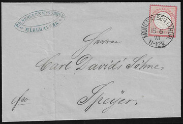 "Mühlhausen i. Thür. F.", roter Franko-K1 auf zwei Briefen 1869/71, sowie in schwarz teilaptiert auf Brief 1 Gr. Brustschild