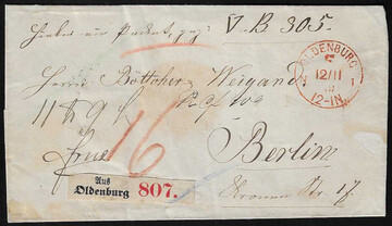 "Oldenburg im Grossh. F.", roter Franko-K1 auf zwei Briefen, einmal Paketbegl. nach München, sowie vom 2.2.1871 in seltener rotvioletter Farbe (nur ein weiterer Brief bekannt) auf Wertbrief (Gebrauchserhaltung)