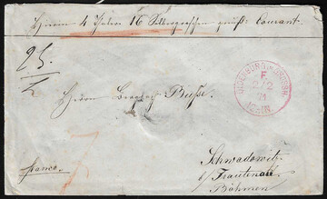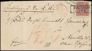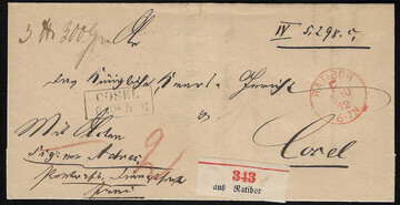 "Ratibor F.", roter Franko-K1 auf vier Briefen 1868-72, dabei Auslandsbrief nach Rheims (Taxe "4 1/2"), zwei Wert- und ein Paketbegleitbrief