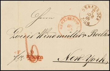 "Osnabrück F.", roter Franko-K1 auf drei Briefen, u.a. 1869 nach New York, sowie 1870 Postvorschuß-"Auslagen"-Brief mit zwei Franko-K1
