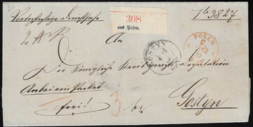 "Posen F.N.1", roter Franko-K1 auf drei Briefen 1868-1873, einmal seltene Briefpost, zweimal Fahrpost, dabei bisher spätest registriertes Verwendungsdatum, 2.12.73