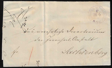 "Stettin F.N.1", roter Franko-K1 auf NDP-Aufbrauchs-Ganzsache 1 Gr. a. 1 Sgr. (kl. Gebrauchsmgl.), diese nebst schwarzem K2 "Stettin" als Paketbrief nach Zwönitz