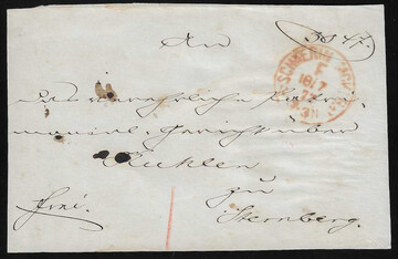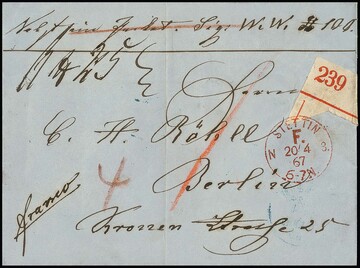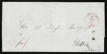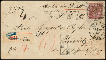 "Stettin F.N.3", roter Franko-K1 auf fünf Briefen 1867-72, der erste stammt vom 20.4.67 und ist zur Preußenzeit ein Unikat (nächstfrühere Verwendung 12.6.68), dieser als Paketbegleitung, wobei der "F.N.3" zu dieser Zeit wohl nur ein Reservestempel war