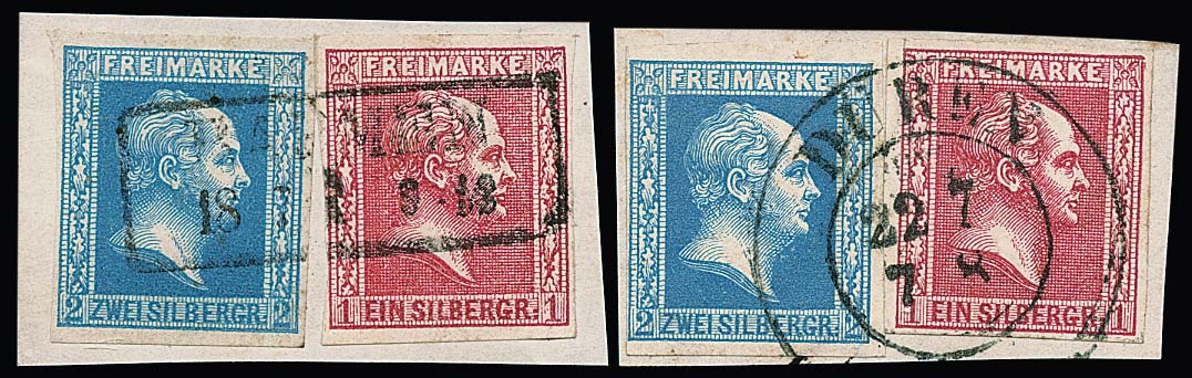 1 Sgr. rosa in seltener Kombination mit 1 Sgr. karmin auf Briefstück (Marken waren gelöst und replatziert) mit geradem Ra2 "Bremen", dazu gleicher Ra2 auf 3 Sgr. orange