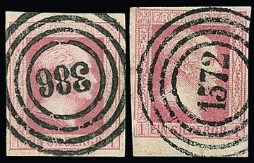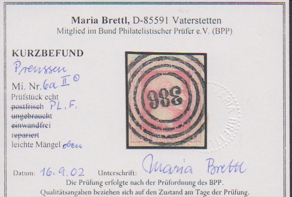 1 Sgr. rosa, Plattenfehler "linker Aussenrand gebrochen" und "Kerbe im Oberrand" (diese winziger Randmangel oben) je gestempelt, eine Fotoexp. Brettl. Mi. 1500,-