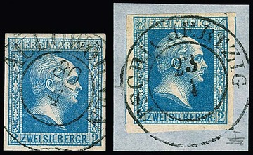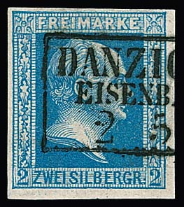 2 Sgr. blau (Danziger Eisenbahn-Ra3, sign. Kastaun) und dunkelblau (Briefstück), zwei Kabinettstücke, Mi. 270,-