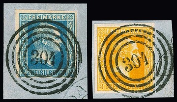 2 Sgr. blau bzw. 3 Sgr. gelb, zwei Luxusbriefstücke mit Danziger NS "304", sign. Brettl, Feuser bzw. Meier