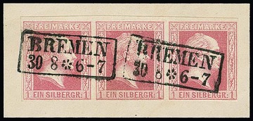 1 Sgr. karmin, waagerechter Luxus-Dreierstreifen auf Unterlage mit idealem Ra2 "Bremen"