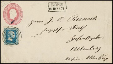 2 Sgr. blau, perfektes Exemplar, teils kurios mit Messerspitzentrennung, auf Ganzsache 1 Sgr. rosa, mit NS "155" und Ra2 "Bonn" nach Altenburg