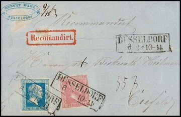 2 Sgr. blau, breitrandig, in Mischfrankatur mit vollrandiger 1 Sgr. rosa, auf prachtvollem Einschreibe-Faltbrief (links oben gering fleckig) mit Ra2 "Düsseldorf" 1861 nach Crefeld (bekannte Korrespondenz "von Beckerath-Heilmann"). Attest Brettl "tadellose Erhaltung. Attraktive Mischfrankatur."