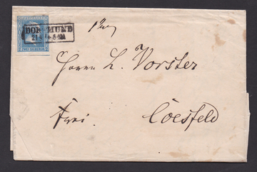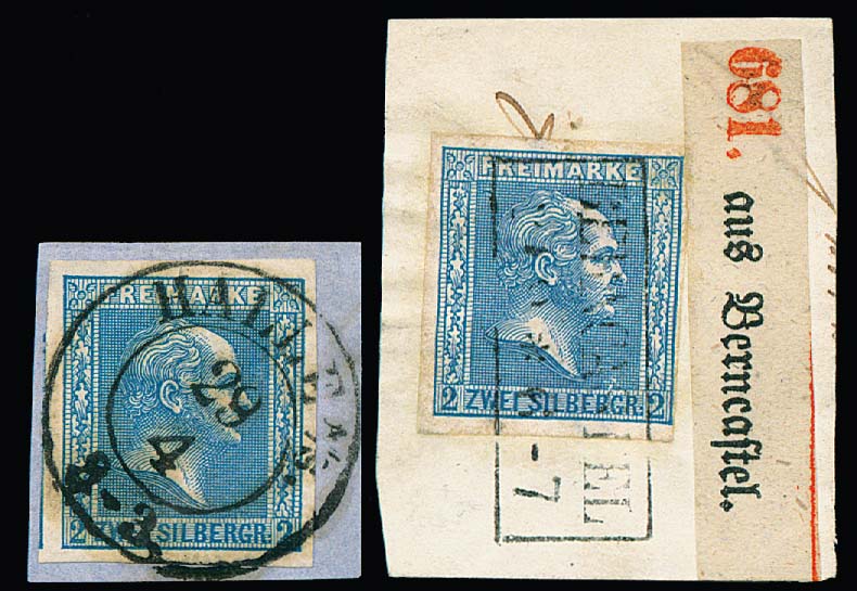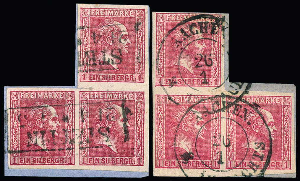 2 Sgr. blau (Nuancen), je Kabinettstücke auf zwei Briefen mit klaren Ra2 "Dortmund" bzw. "Tilsit", sowie 3 Sgr. orange auf Kabinettbrief mit Ra3 "Berlin Stadtpost-Exp. IX"