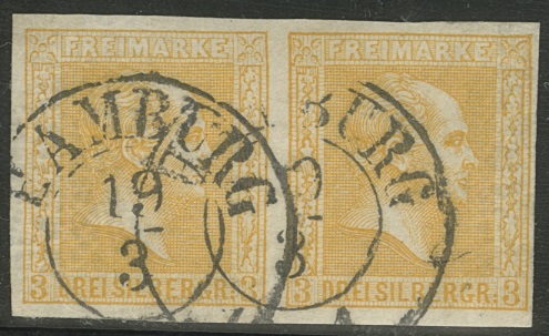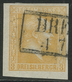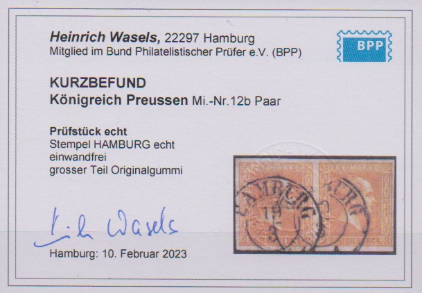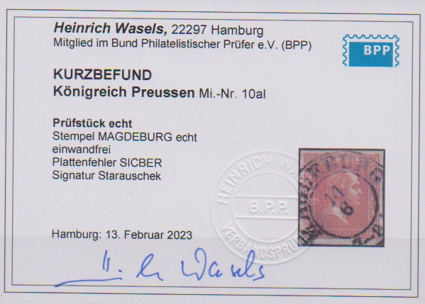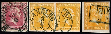 1 Sgr. karmin, Plattenfehler "SICBER", ferner kleine Kabinett-Bogenecke 3 Sgr. gelborange auf dünnem Papier (Feld 141), sowie Kabinettpaar 3 Sgr. gelb, je Fotoexp. Wasels. Mi. 395,- +