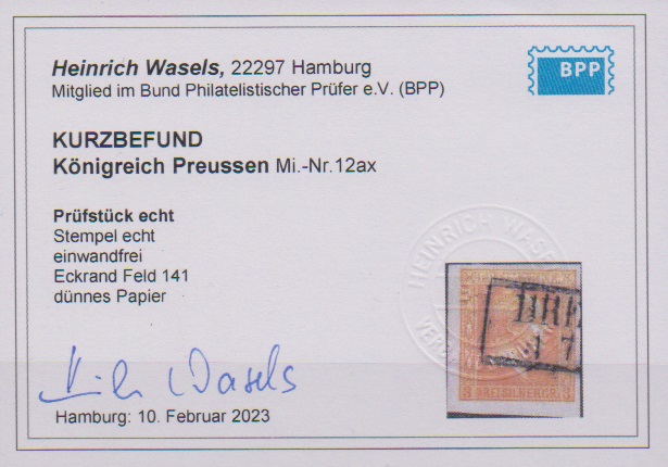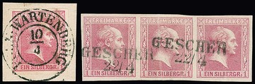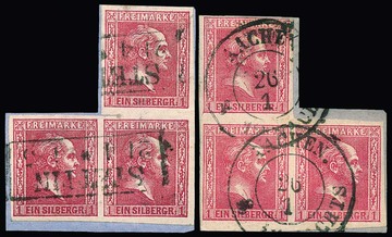 1 Sgr. rosa, karmin, 12 schön gestempelte Exemplare, u.a. Luxusbriefstück mit vorphil. K2 "Poln. Wartenberg", Paar (linke Marke "SICBER") auf Kabinettbriefstück, sowie Dreierstreifen (Mittelmarke Bug) mit vorphil. L2 "Gescher"