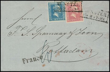 1 Sgr. rosa und 2 Sgr. blau, je gut geschnitten, auf zwei Prachtbriefen 1859 aus einer Korrespondenz von Münster (Ra2) nach Rotterdam/Holland