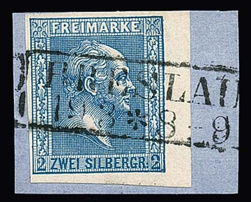 2 Sgr. blau aus der rechten unteren Bogenecke mit bis zu 3,5mm Bogenrand, auf Kabinettbriefstück mit Ra2 "Breslau", sign. Engel