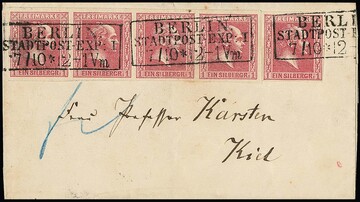 1 Sgr. dunkelrosa, Viererstreifen und Einzelstück auf vollfrankiertem Kabinettbriefchen mit Ra3 "Berlin Stadtpost-Exp. I" nach Kiel/Dänemark