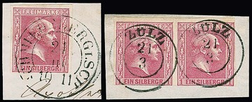 1 Sgr. lilarosa auf Kabinettbriefstück mit K2 "Schmiedeberg i. Sch." (Sondertype mit offenem Innenkreis), dazu drei weitere Briefstücke mit Paaren 1 Sgr. (u.a. K2 "Zülz") und ein Briefstück mit 3 Sgr. ockerbraun per zwei und vorphil. K2 "Bentschen" (Patina)