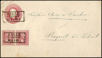 1 Sgr. rosa, Kabinettpaar mit geradem Ra3 "Halle Bahnhof", rechte Marke Plattenfehler "SICBER", auf Ganzsache 1 Sgr. rosa