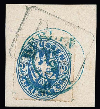 2 Sgr. blau auf Kabinettbriefstück mit Doppelentwertung durch blauen K2 "Berlin" und schwarzen Distributions-Ra2