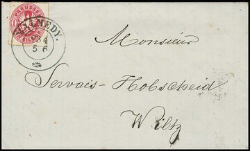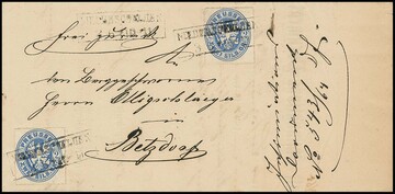 1 Sgr. rosa, zwei rund geschnittene Exemplare auf Brief mit K2 "Ratibor" nach Neiße, der Brief mit 2 Sgr. nachtaxiert, links oben Vermerk "Aus dem Briefkasten"