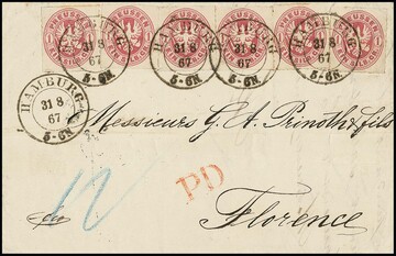 1 Sgr. rosa, sechs Exemplare (drei etwas Schere bzw. leichte Randtönung) auf völlig ursprünglich erhaltenem gef. Auslandsbrief mit K2 "Hamburg" 1867 nach Florenz/Italien