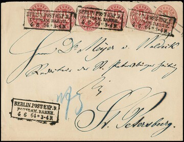 1 Sgr. rosa per fünf (zwei Paare) auf Ganzsache 1 Sgr. rosa im Großformat, mit Ra3 "Berlin Post-Exp. 9 Potsdam. Bahnh." 1864 nach St. Petersburg/Rußland gelaufen. Dekorativer Brief in guter, ursprünglicher Erhaltung
