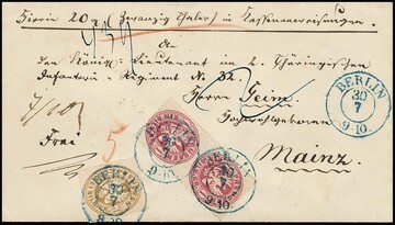 1 Sgr. karmin im Paar sowie 3 Sgr. ockerbraun, Kabinettstücke auf Militär-Wertbrief mit blauem K2 "Berlin" an einen Leutnant in der Bundesfestung Mainz (1861-1866 Krieg gegen Österreich), sign. Kruschel. Als Beigabe ein preußischer Kassenschein über 1 Thaler aus Berlin 1861