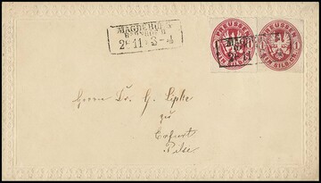 1 Sgr. rosa, karmin, jeweils per zwei (ein Paar, einmal von versch. Auflagen), auf zwei Präge-Zierbriefen aus gleicher Korrespondenz von Magdeburg (Ra3 "Magdeburg Bahnhof`" bzw. "Eisenb. Post-Bureau 7 Magdeburg") je nach Erfurt