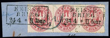 1 Sgr. rosa im Dreierstreifen auf Kabinettbriefstück mit besserem Bahnpost-Ra3 "Neisse-Brieg II. tour" und zusätzlich (!) blauem Hamburger Stadtpost-Ovalstempel