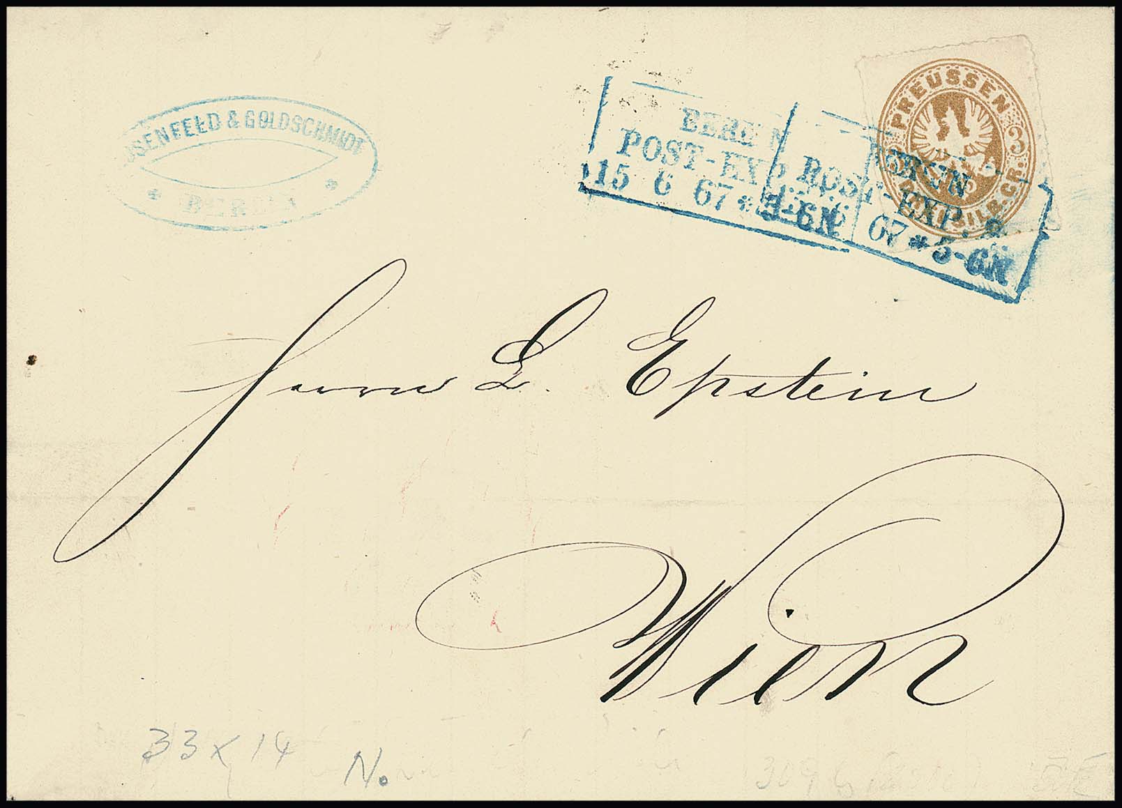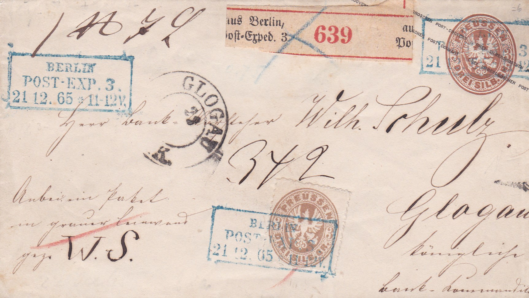 3 Sgr. ockerbraun, Kabinettstück auf Ganzsache 3 Sgr. ockerbraun, mit besserem blauem Ra3 "Berlin Post-Exp. 3", 21.12.65, als Paketbrief nach Glogau