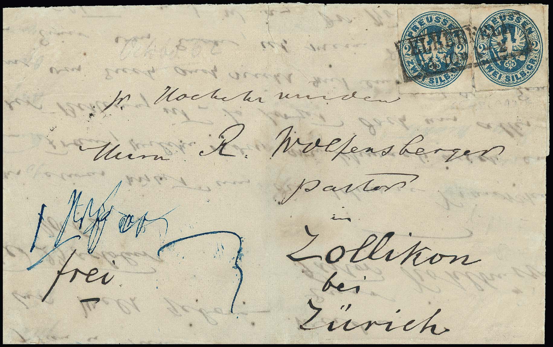 2 Sgr. preußischblau per zwei als gute Mehrfachfrankatur dieser Nuance auf Auslandsbrief von Elberfeld nach Zollikon bei Zürich (3 + 1 Sgr.). Brief und Marken kleine Mängel, u.a. innen gestützt (auch Frankatur)