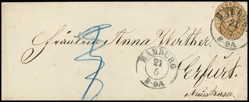 3 Sgr. ockerbraun, je kurios rundgeschnittene Exemplare (einmal um den Rand geklebt) auf zwei Damencouverts aus gleicher Korrespondenz mit K2 "Hamburg" (alter bzw. neuer K2 mit Jahreszahl "64") nach Erfurt, einmal Nachtaxe gestrichen und Frankatur anerkannt