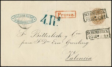 3 Sgr. ockerbraun, Kabinettstück auf Teilfranko-Brief mit Ra2 "Schönebeck" 1863 nach Valencia/Spanien, nur bis Postvereinsgrenze frankiert, Inlandsporto gemäß blauem Taxstempel "4 Rs." vom Empfänger erhoben