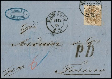 3 Sgr. ockerbraun (rechts unten leicht "stempelölig") als sehr seltene Einzelfrankatur auf gefaltetem Brief mit K2 "Hamburg", 14.12.67, nach Turin/Italien. Ab dem 23. Sept. 1867 konnte Post nach Italien via Österreich zum neuen, reduzierten 3-Sgr.-Porto frankiert werden. Preußen-Briefe mit dieser neuen, reduzierten Gebühr sind sehr selten, wie auch das Attest Wasels bestätigt