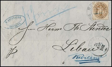 3 Sgr. ockerbraun auf gef. Treilfranko-Prachtbrief mit K2 "Hamburg Bahnhof" und leichtem Blaustrich nach Libau/Kurland, hs. "fr. Grenze", rs. Taxe "10" Kop., die vom Empfänger erhoben wurden