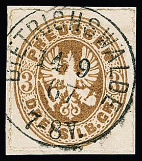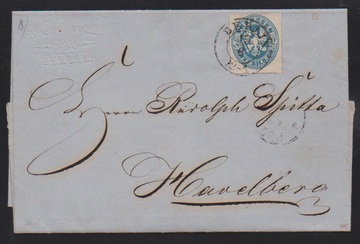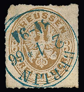 3 Sgr. ockerbraun (links oben kleiner Eckfehler) mit sehr schön zentrischer Entwertung durch blauen K1 "Berlin 2.4.66". Dieser von Schilling angefertigte Versuchsstempel des Hofpostamtes war nur kurz in Gebrauch und gehört zu den Stempelraritäten Berlins, KHBW 2500 P.