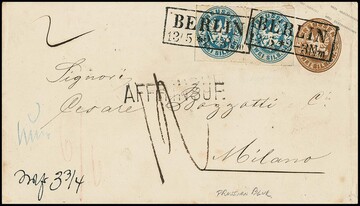 2 Sgr. preußischblau per zwei (teils Scherentrennung) auf Ganzsache 3 Sgr. braun als Doppelbrief mit großem Ra2 "Berlin" nach Mailand, unterfrankiert (L1 "AFFR. INSUF.") und nachtaxiert, typische Gebrauchsspuren, sign. Flemming