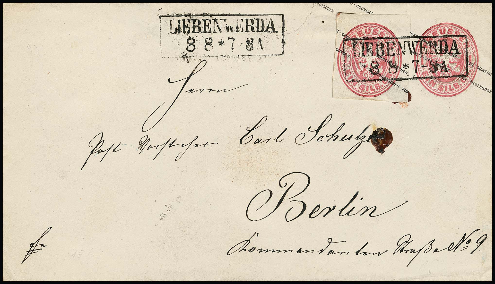 Ganzsachen-Ausschnitt 1 Sgr. rosa, breitrandig viereckig, sowie beschädigt rundgeschnitten mit Siegel aufgeklebt, auf zwei Ganzsachen 1 und 2 Sgr. (rs. kl. Öffnungsmgl.), dazu GAA 17 breitrandig auf Brief, Mi. 500,-