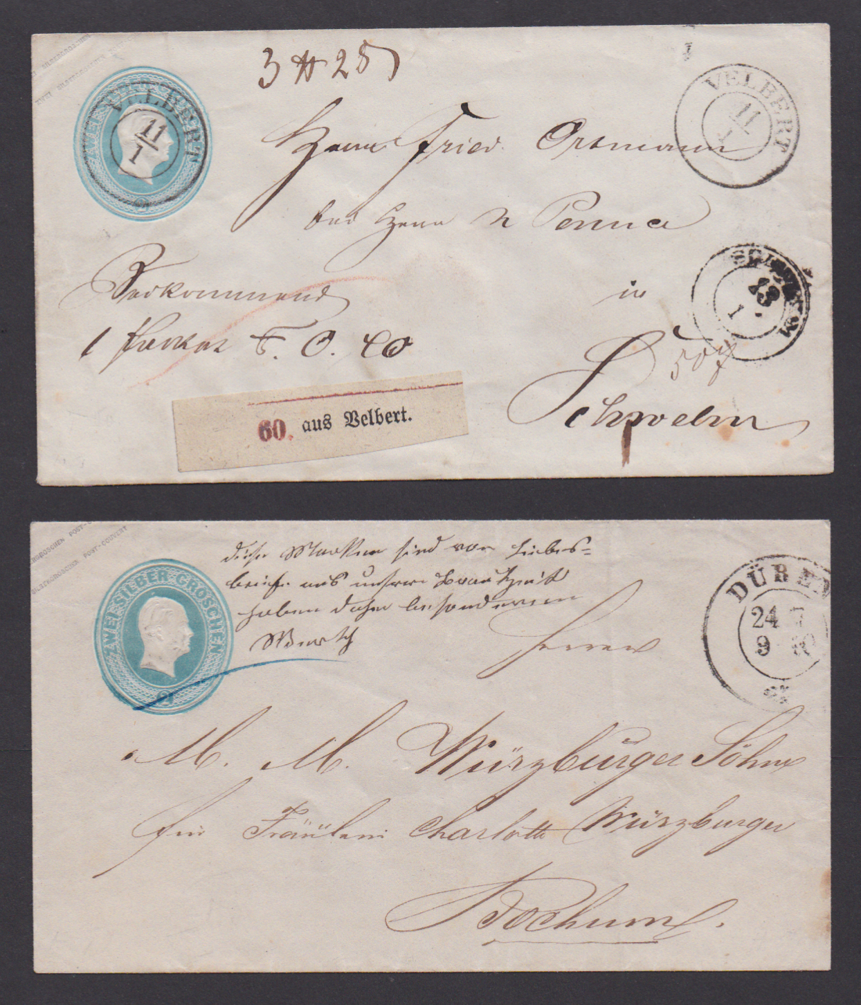 Zwei Kopf-Ganzsachen 2 Sgr. hellblau, mit besserem Zier-K2 "Düren", bzw. mit vorphil. K2 "Velbert" als Paketbrief