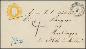 Kopf-Ganzsache 3 Sgr. gelb (leichte Patina) als Teilfranko-Auslandsbrief mit K2 von Königsberg in das zu dieser Zeit dänische Kniphagen bei Lübeck, hs. "fr. Grenze", vom Empfänger 4 Sk. erhoben, rs. zwei versch. Stempel von Lübeck 1855